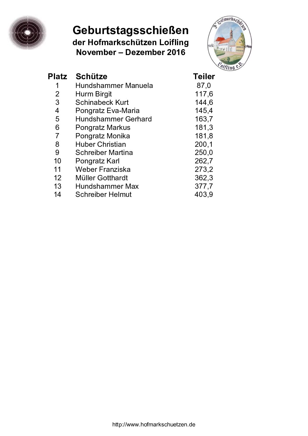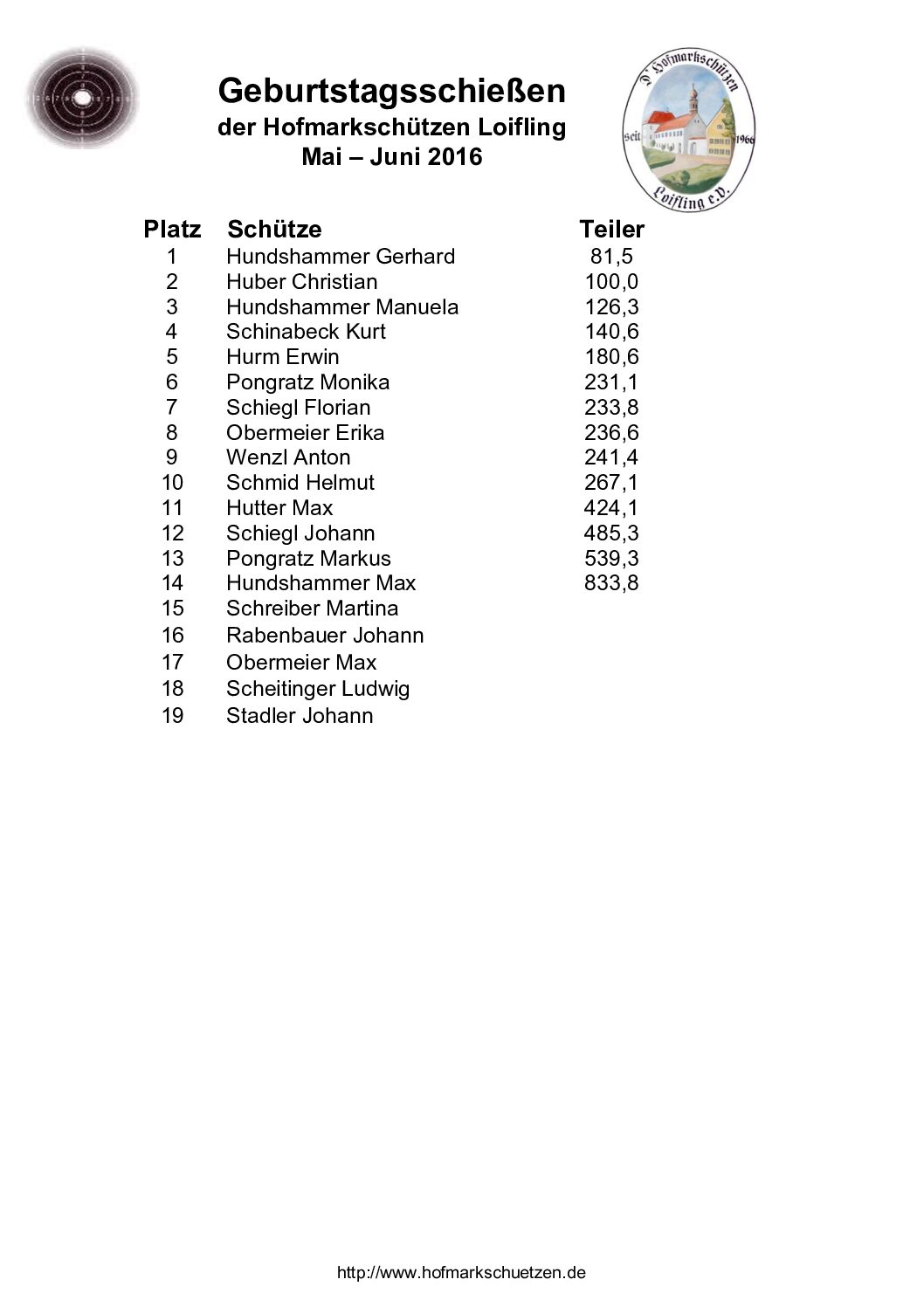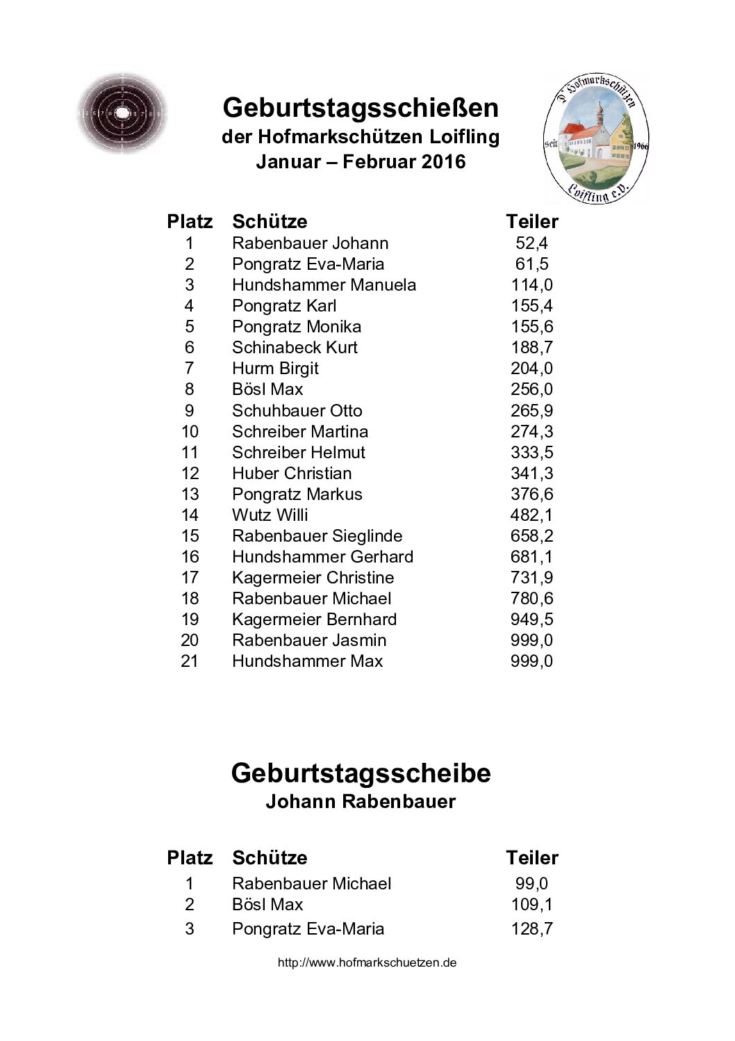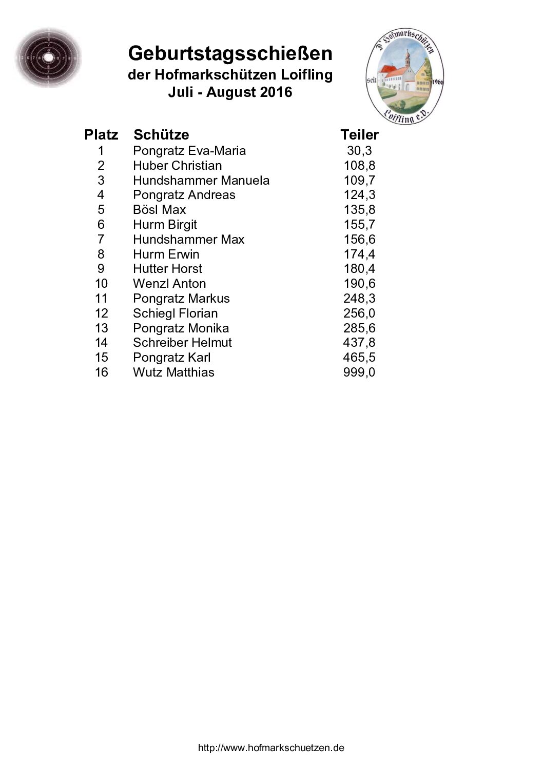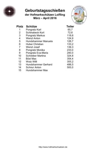 Ergebnisse Geburtstagsschießen 2016