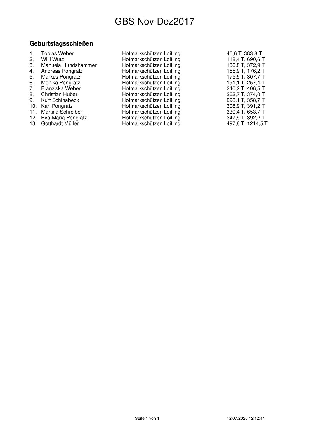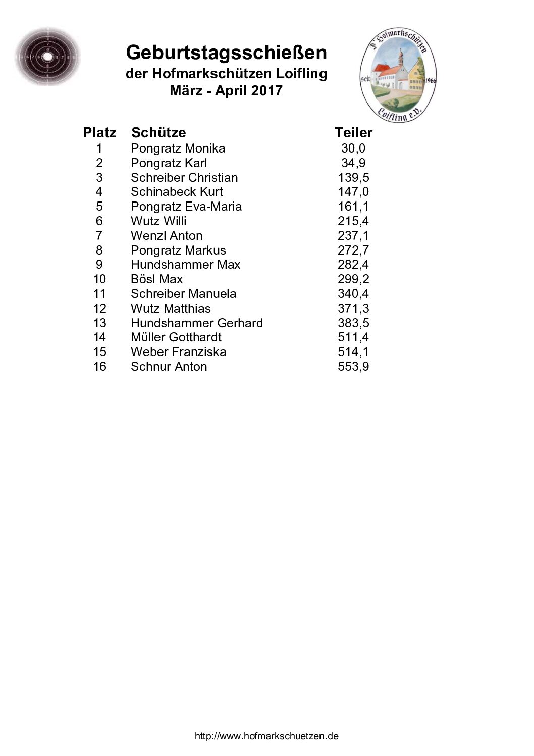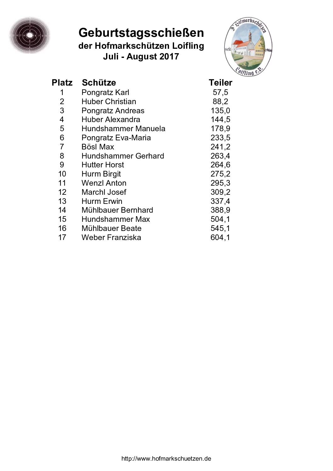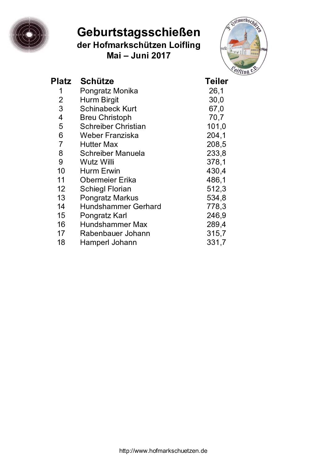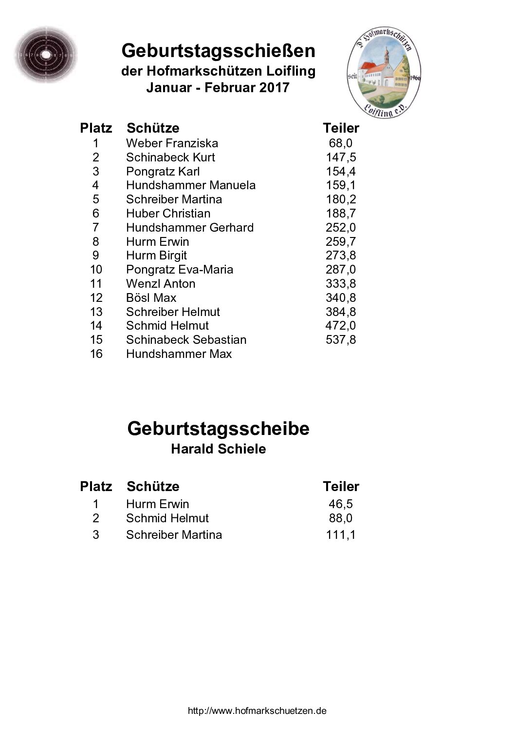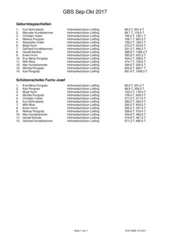Ergebnisse Geburtstagsschießen 2017